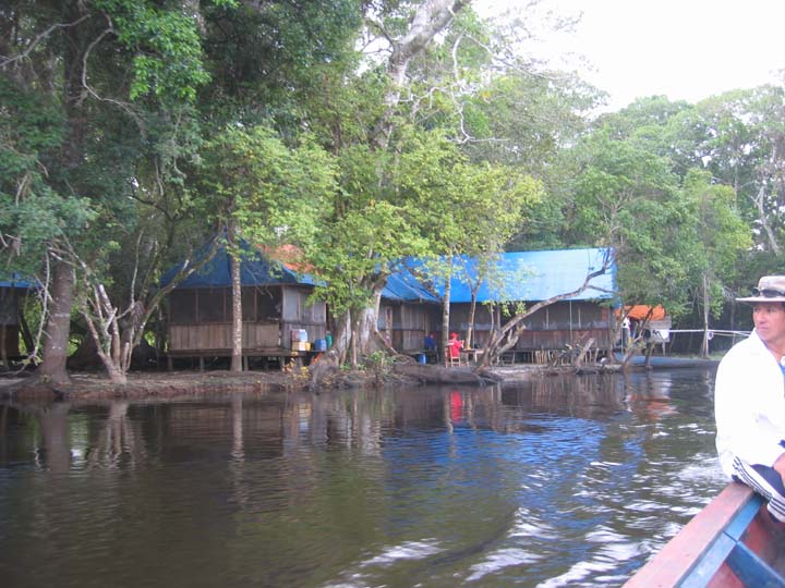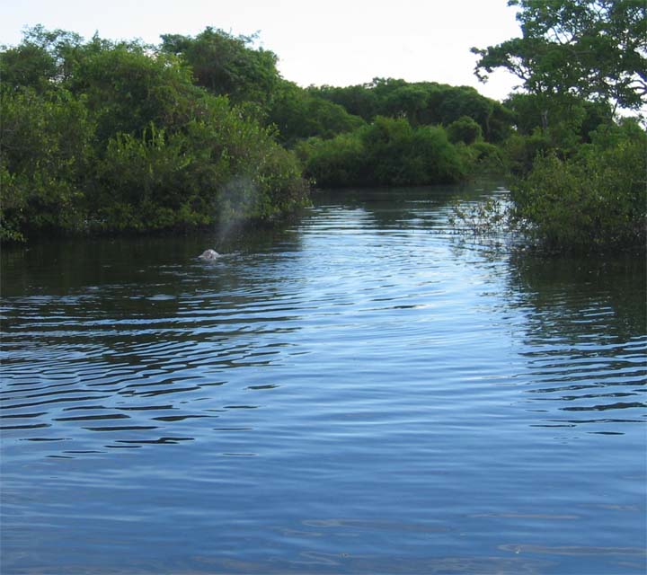 Afterwards though, we did something very fun. We drove around the river in the boat attracting the dolphins from each of the big pools. The guides would knock on the side of the boat, and this noise attracted the dolphins to the boat. We had a trail of freshwater pink dolphins behind us. We stopped at a large pool in the river and jumped in with the dolphins. There were probably around 8 of them. They at time would get pretty close to us. One of the dolphins jumped within a foot or two of one of the guys in our group. Here is a picture of a dolphin blowing through its blow hole.