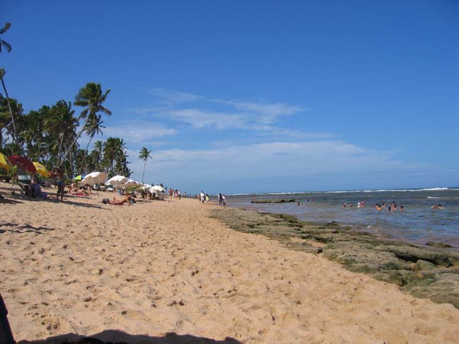 Morro de Sao Paulo is a touristy beach resort along the coast. The only way to get there is by boat. There are no cars in this town. The streets are sand paths. Alongside the paths are hundreds of restaurants, pousadas(hotels) and stores. There are three main beaches in town, and a remote beach which is about a ten minute walk away. After finding a room for the night, we walked through the town and went swimming. That night there was a power outage for a few hours that limited us reading by candlelight.